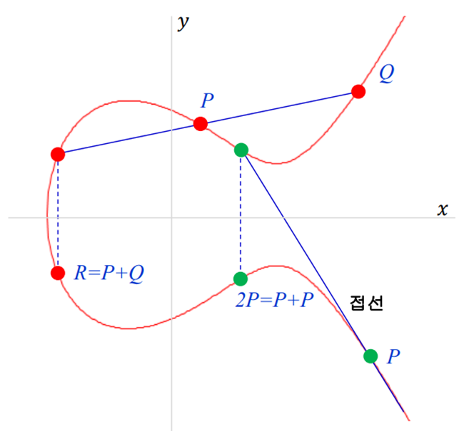 - Adding : 타원 곡선상의 서로 다른 두 점, P와 Q의 합의 연산 (P +Q)은 P와 Q를 연결하는 직선과 교차하는 곡선상의 점의 역인 R