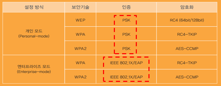 - WPA2는 인증 시 개인모드는 PSK(Pre Shared Key), 엔터프라이즈 모드에서는 EAP 사용